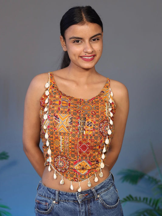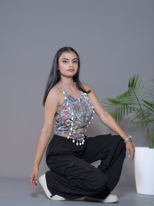 Blue Ethnic Motif Printed Viscose Top & Palazzo With Thread & Mirror Work