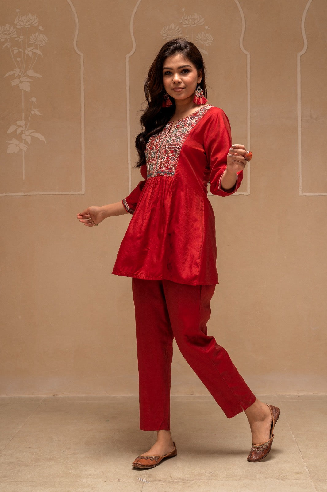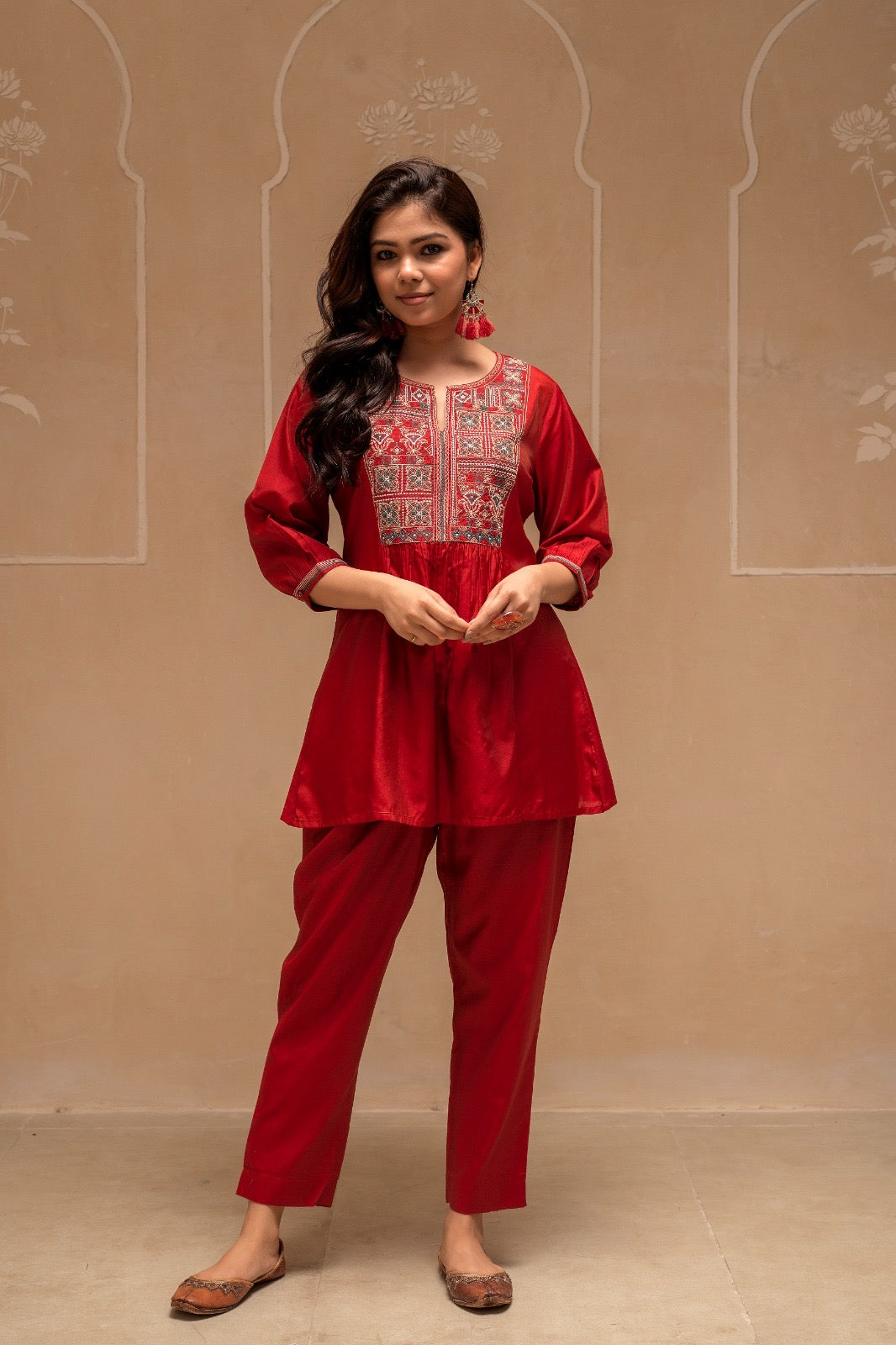 Maroon Solid Viscose Gathered Tunic and Pants Co-ord Set with Thread Work