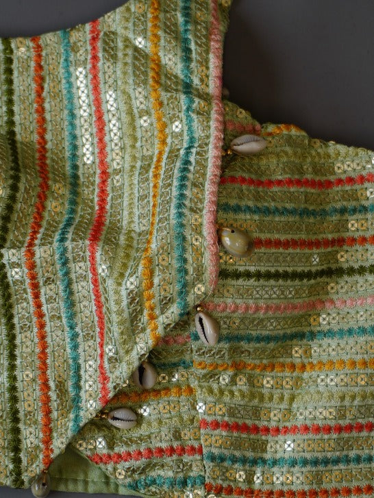 Design : Beautiful crop top with Kodi work, open back style, can go with Jeans, Saree & Lehnga as well.