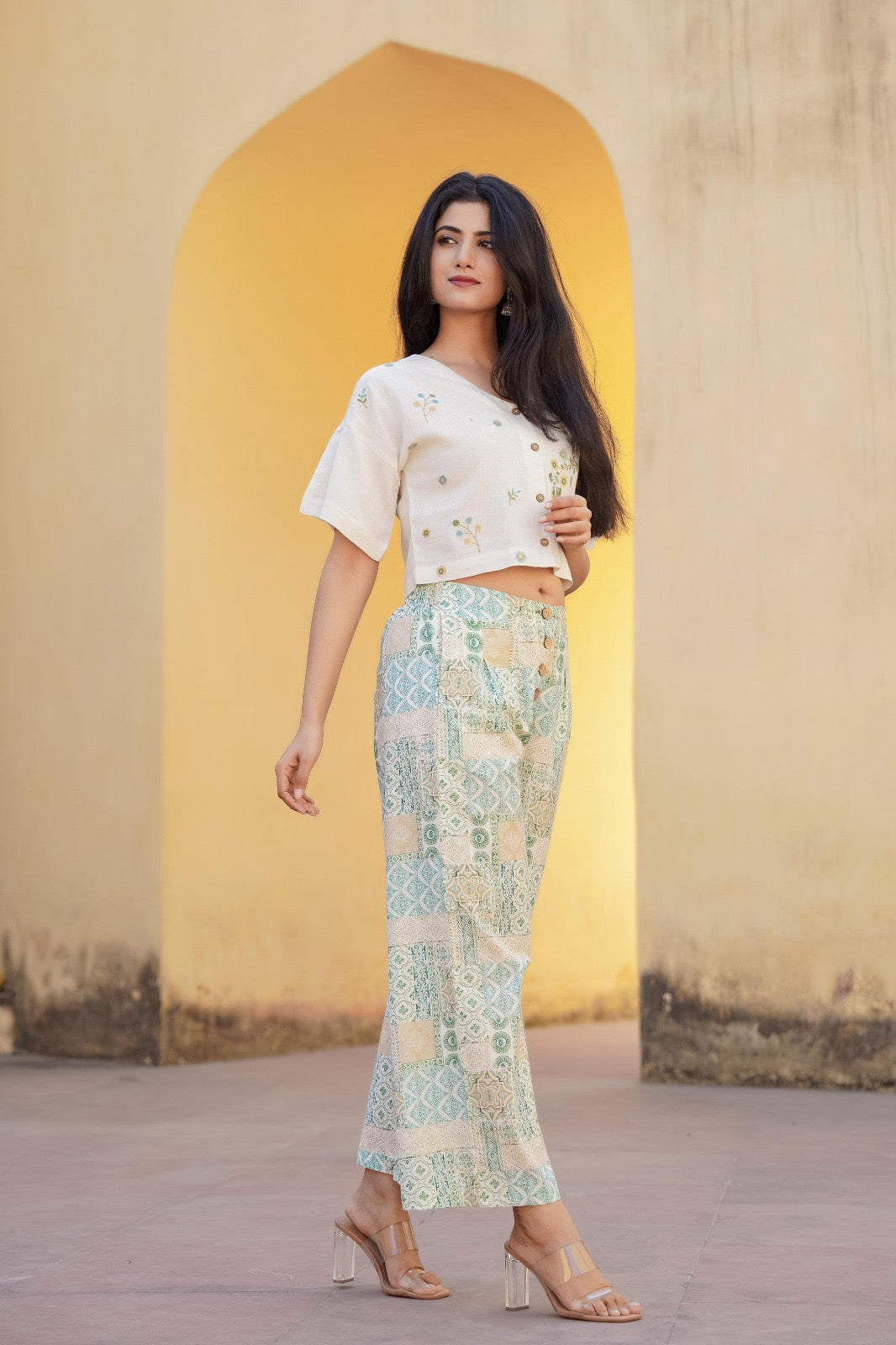 White & Mint Green Ethnic Motif Printed Viscose Top & Palazzo With Thread & Mirror Work